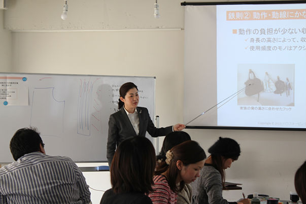 物と人との関わり方から始まり、整理収納の意味や考え方について、スライドを使った講義とグループワークなどの実習を通して学びます。